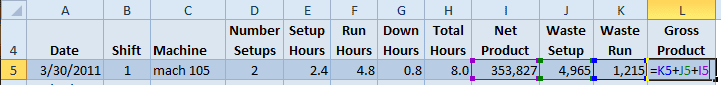 Notice that each column reference in the formula is located between square brackets [ ]. The @ sign refers to "this row" and is also included in square brackets. So the formula in cell L5 for Gross Product equals the values for Net Product in row 5 plus Waste Setup in row 5 plus Waste Run in row 5.